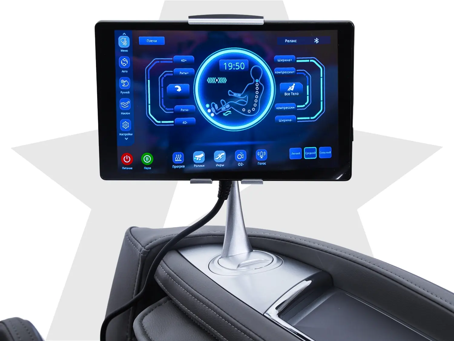 Кресло оборудовано 8-дюймовым цветным LED-экраном с сенсорным управлением, высокой четкостью изображения и полностью русифицированным интерфейсом.